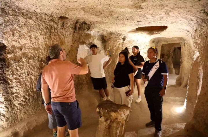 Nevşehir'de hava sıcaklığının 35 dereceyi aşmasıyla birlikte, turistler serinlik aramak için Kapadokya'nın tarihi yer...